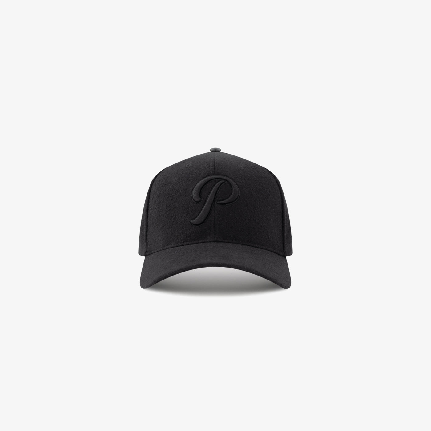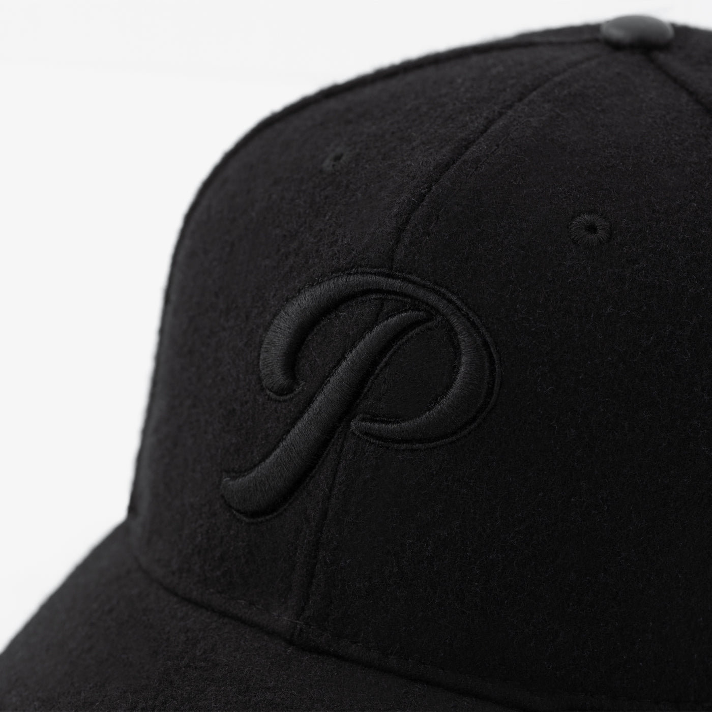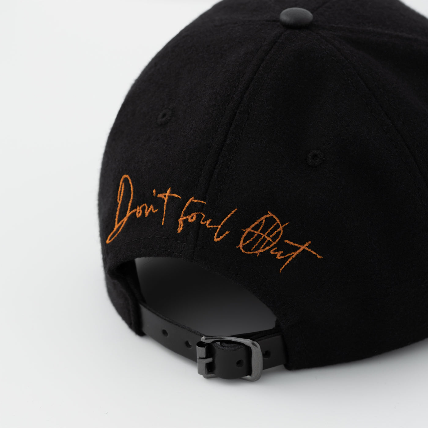 Pre-curved low profile melton wool cap, featuring 3D satin stitch embroidered logo at crown and closure. Jet black underbill, butter soft leather strap with antiqued silver hardware.