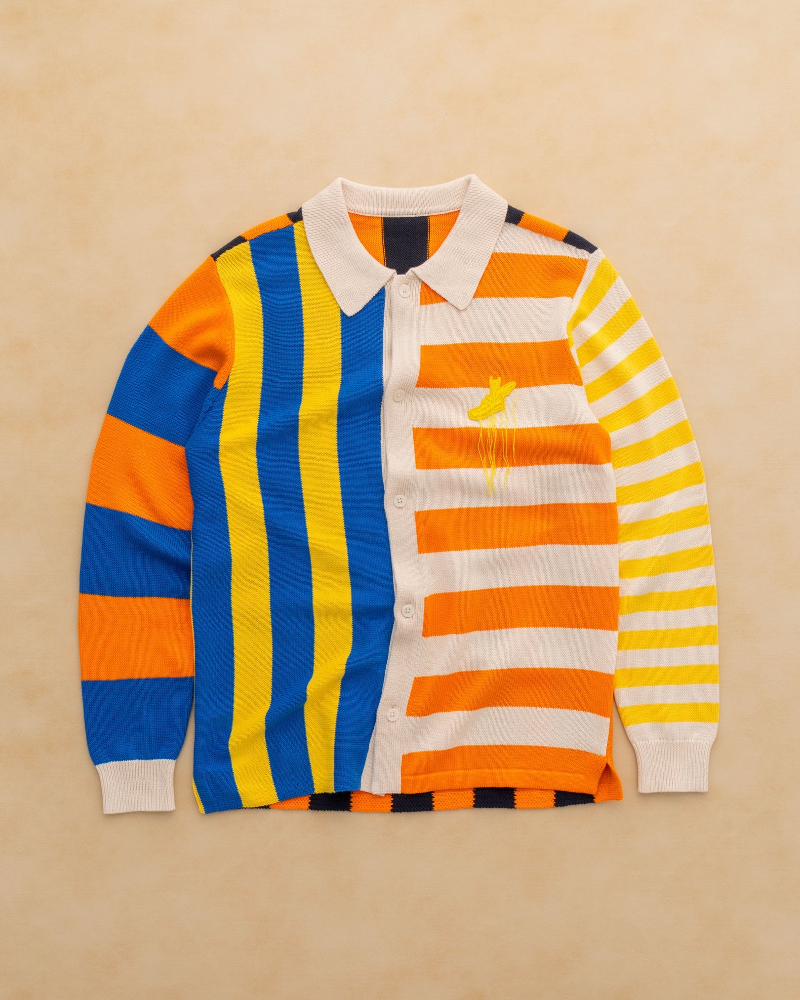Crafted in a 7-gauge jersey knit, this button down features a patchwork of striped patterns across each panel—bringing rhythm and movement to a timeless silhouette. An embroidered fringe Messenger patch accents the left chest, while a large satin-stitch motif anchors the back.