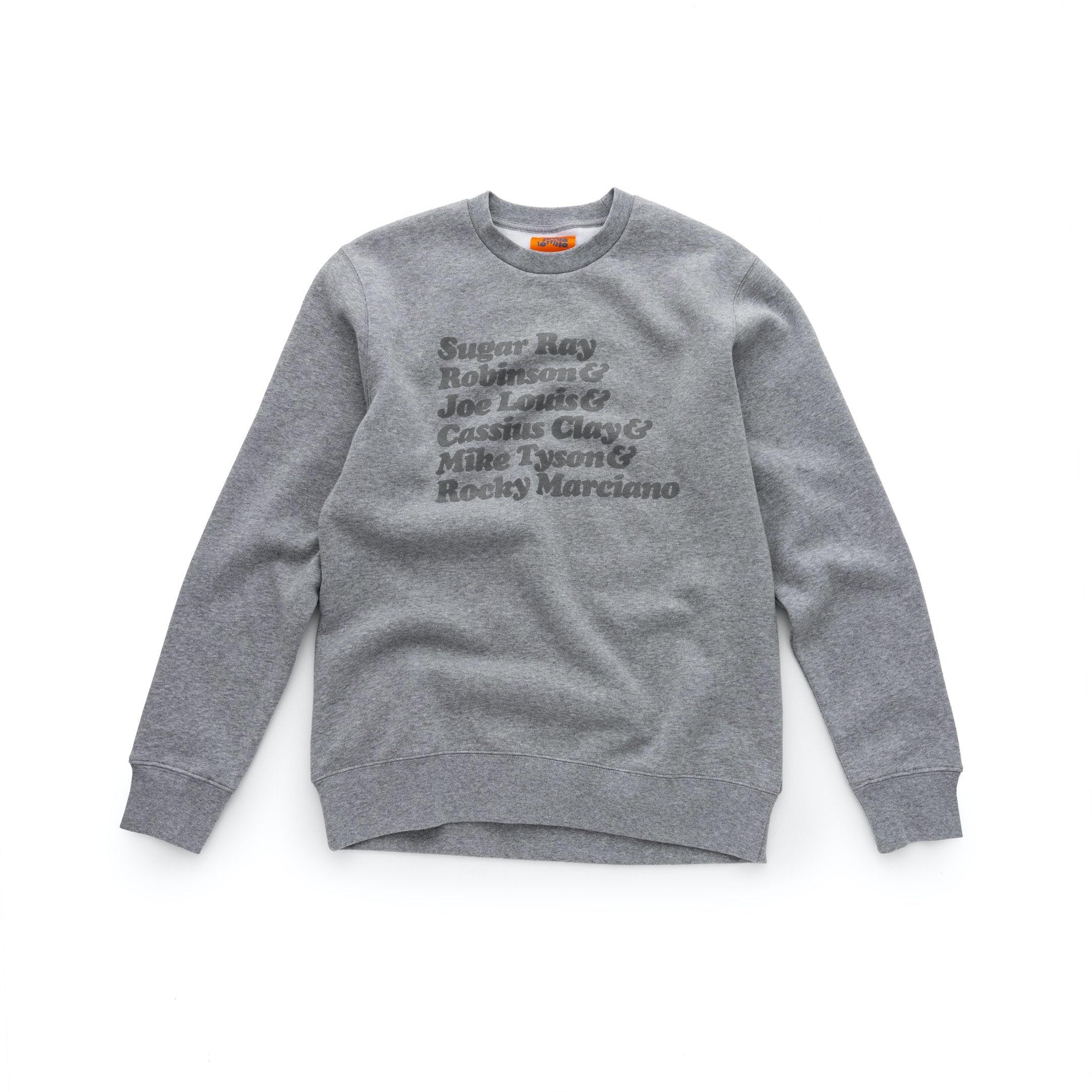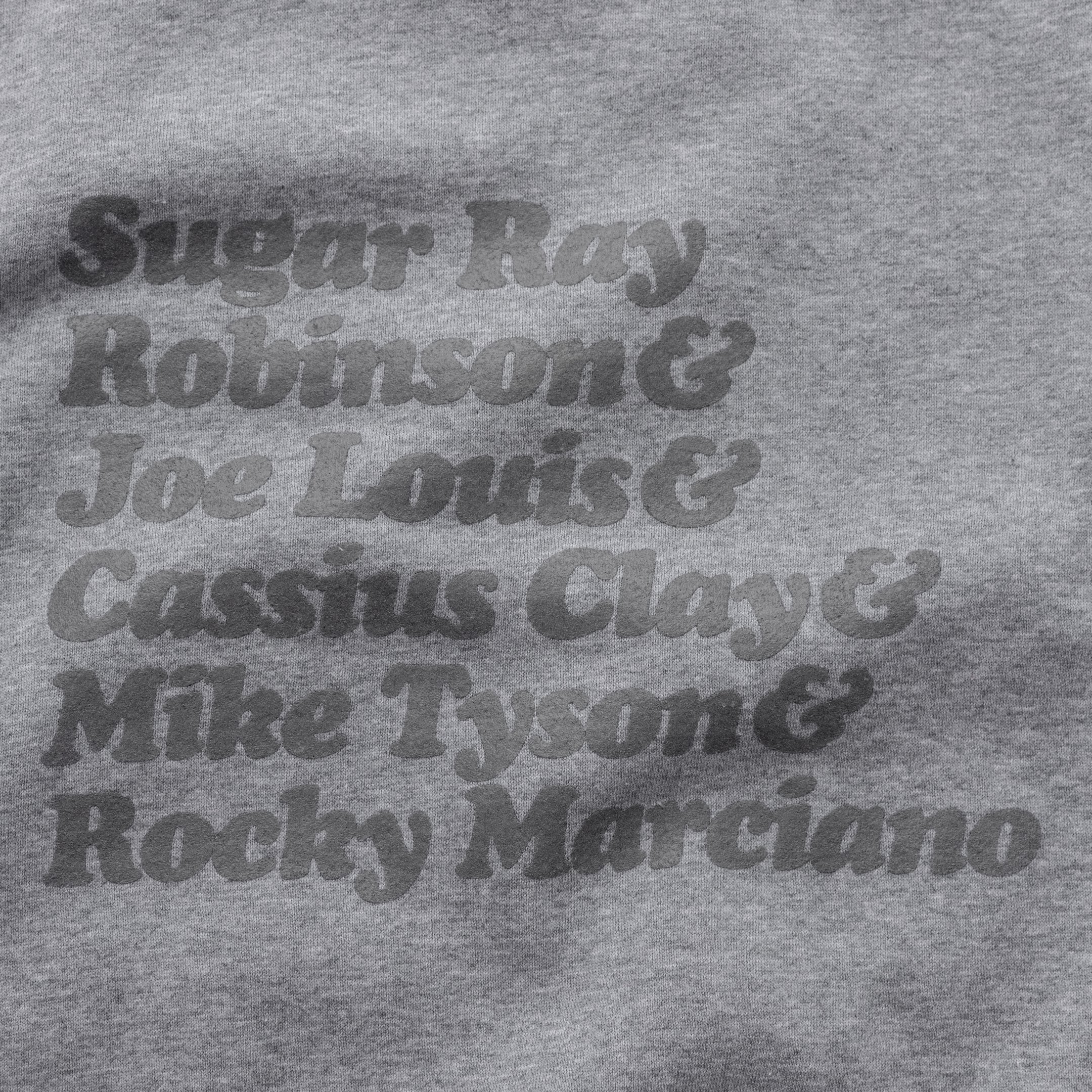 This sweatshirt doesn’t settle the debate. It honors it. A heavyweight roll call pulled straight from the barbershop in Coming to America, where boxing wasn’t just sport—it was legacy, identity, folklore.