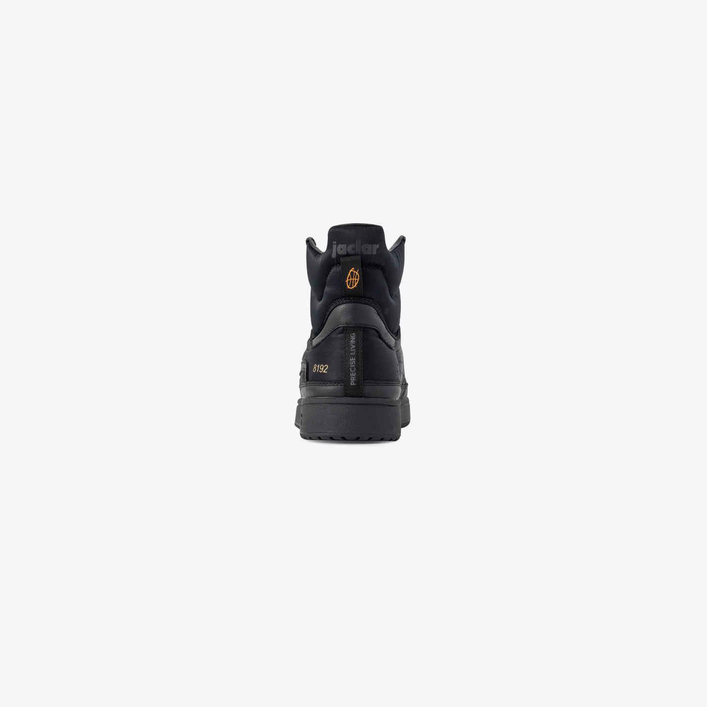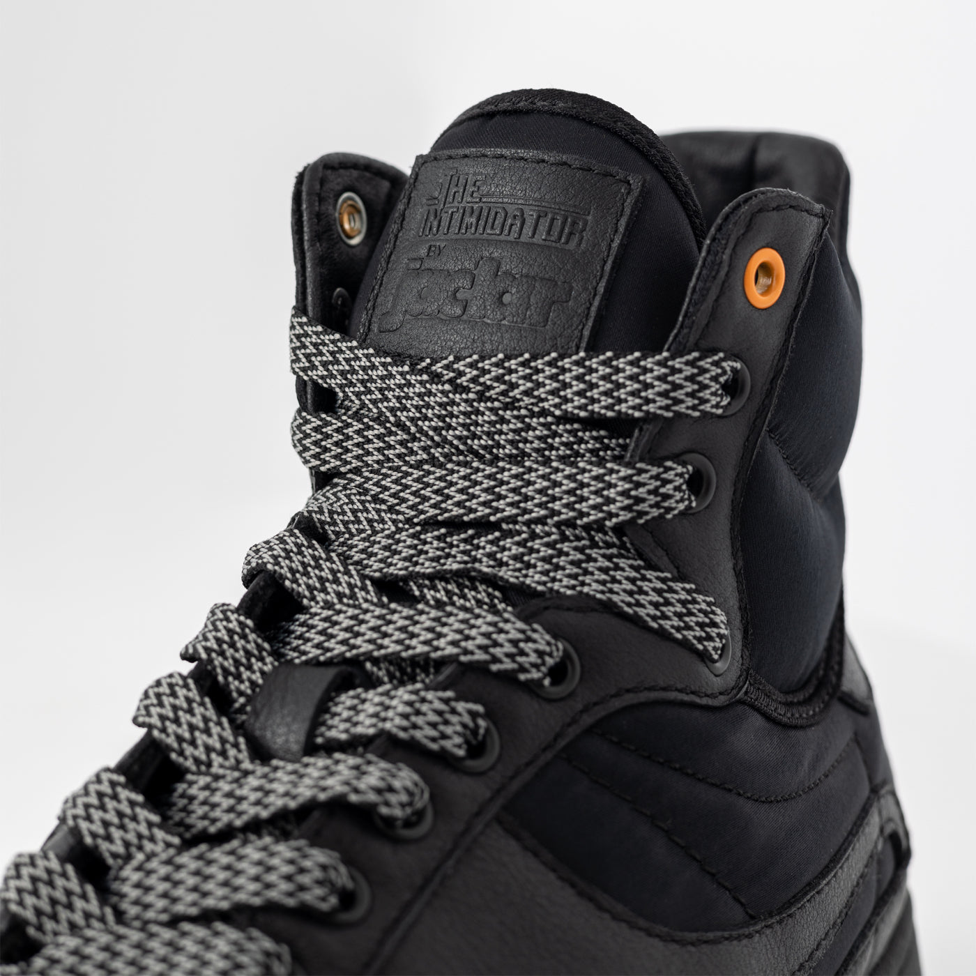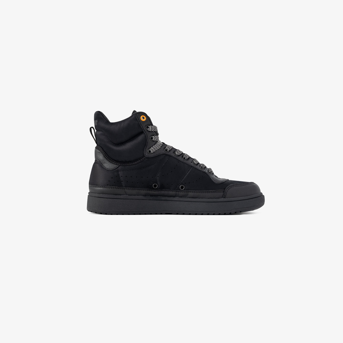 Blacked out upper satin quarter panel, toe-box and padded collar with black tumbled leather “wave”, eye-stays, and heel cap. Low profile rubber sole with jacquard branded pull tab.