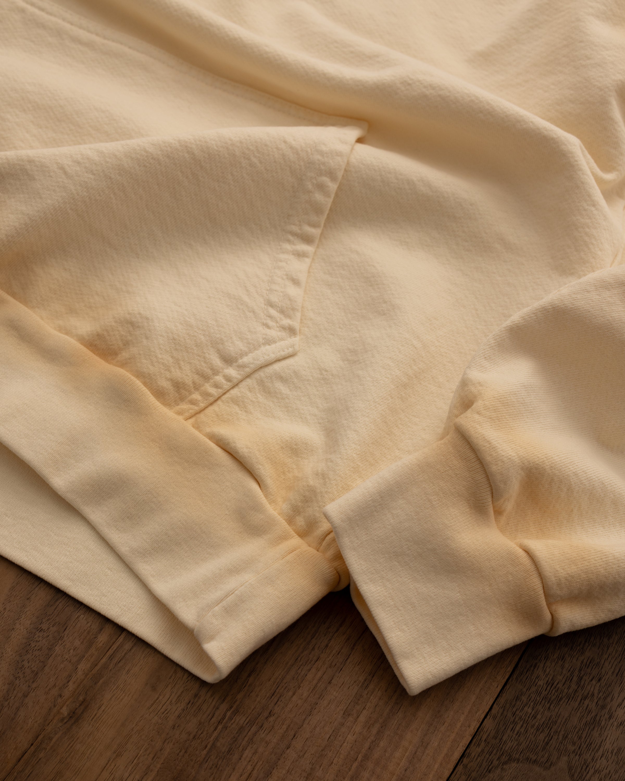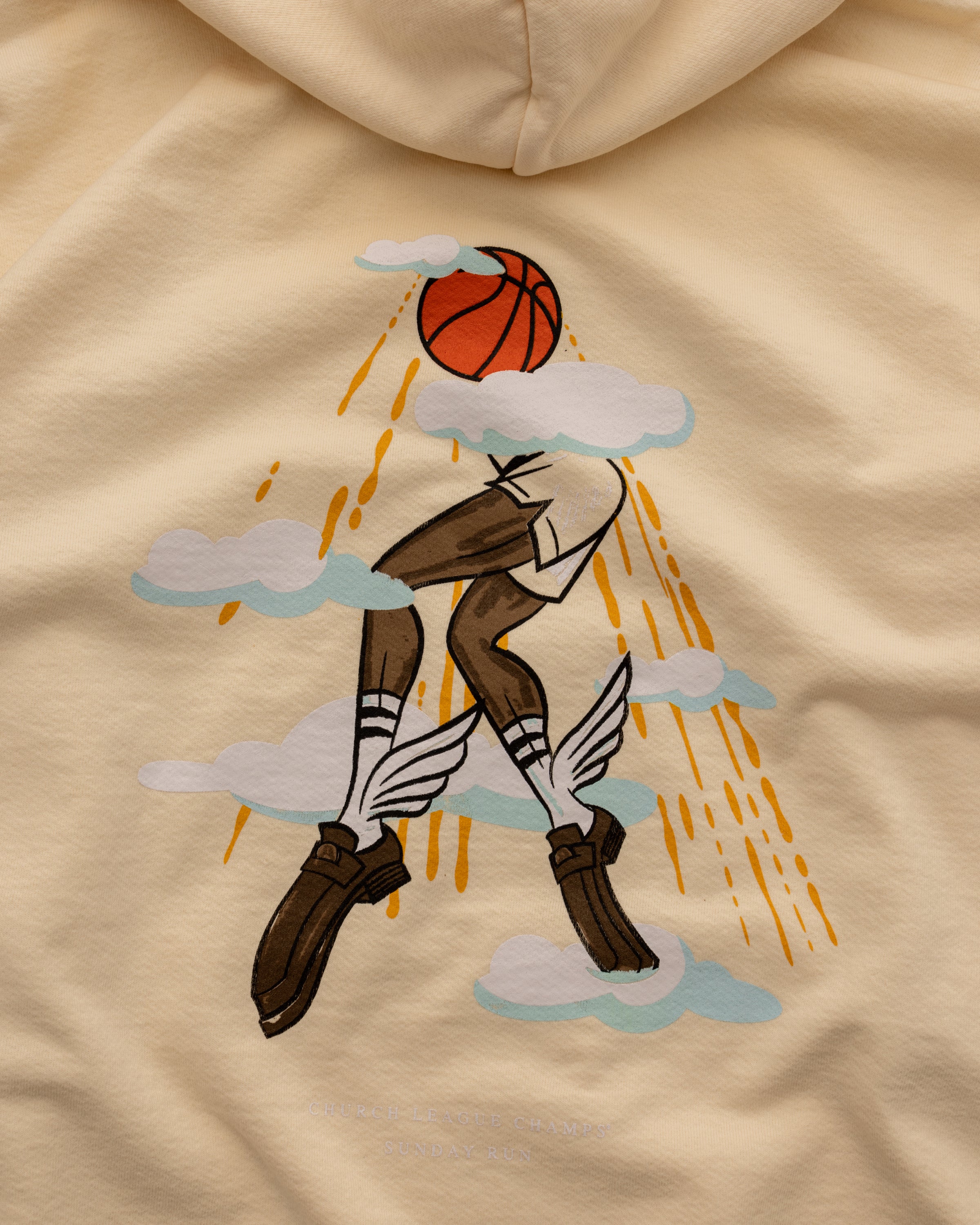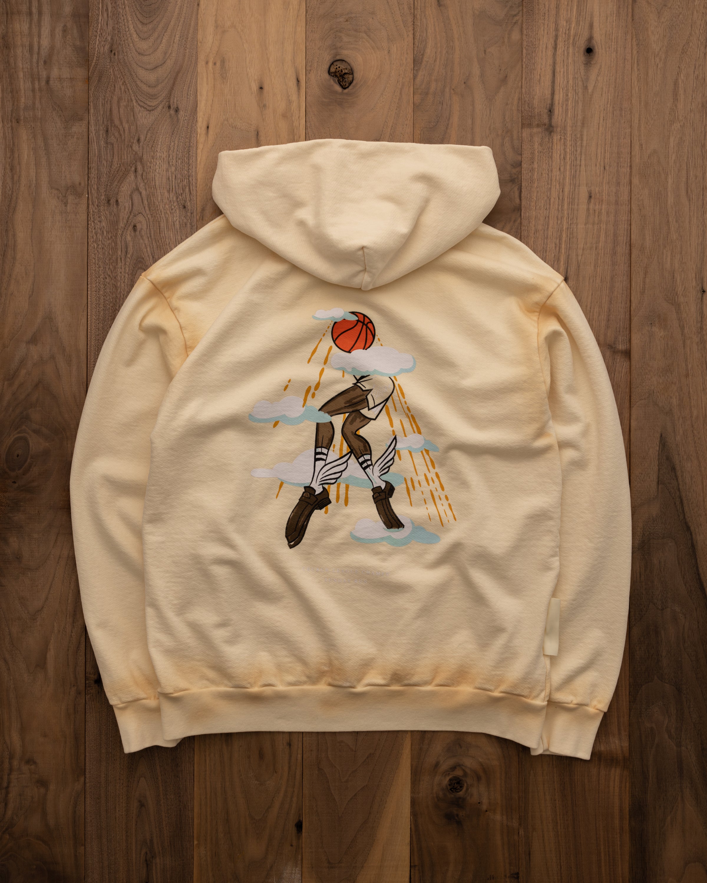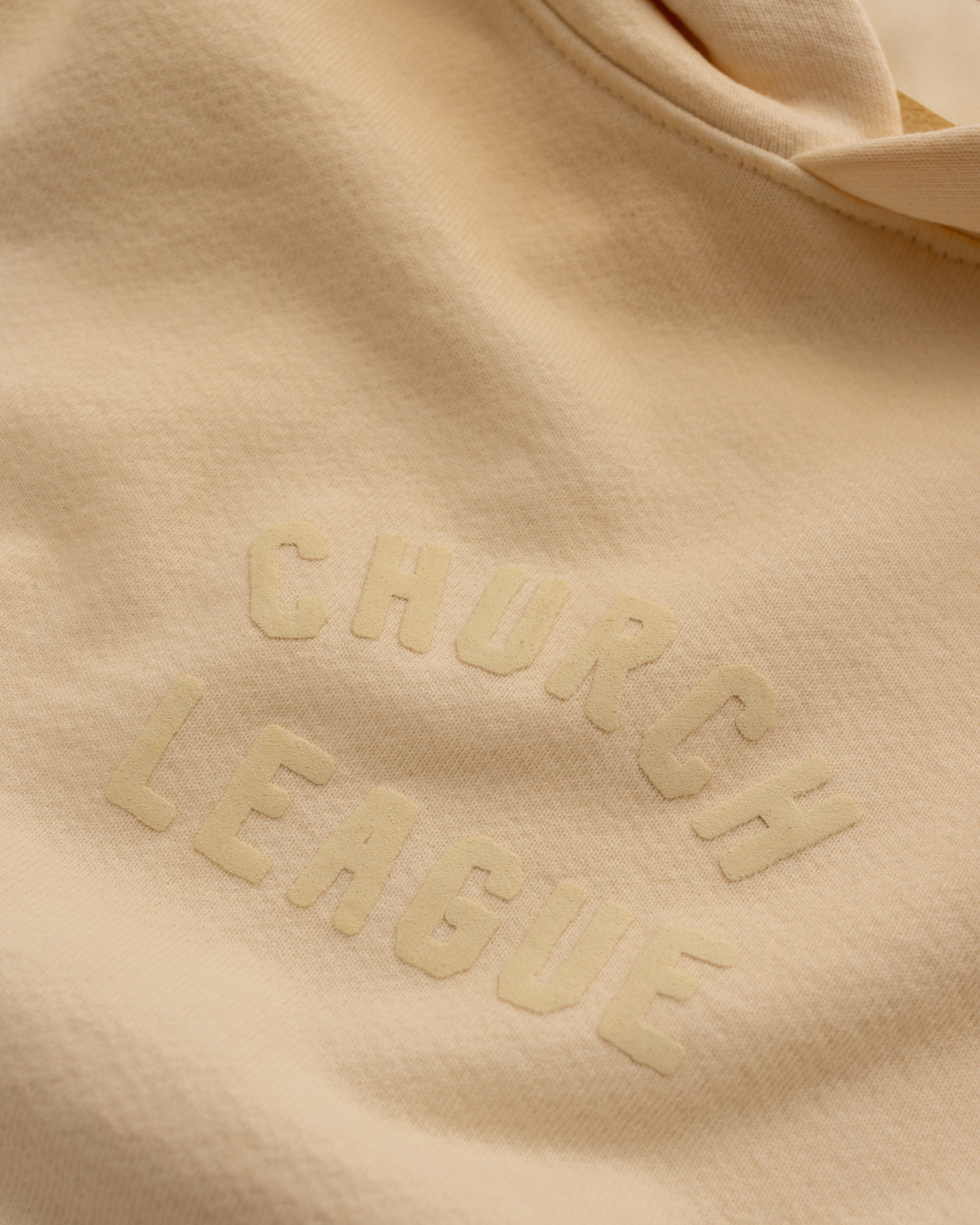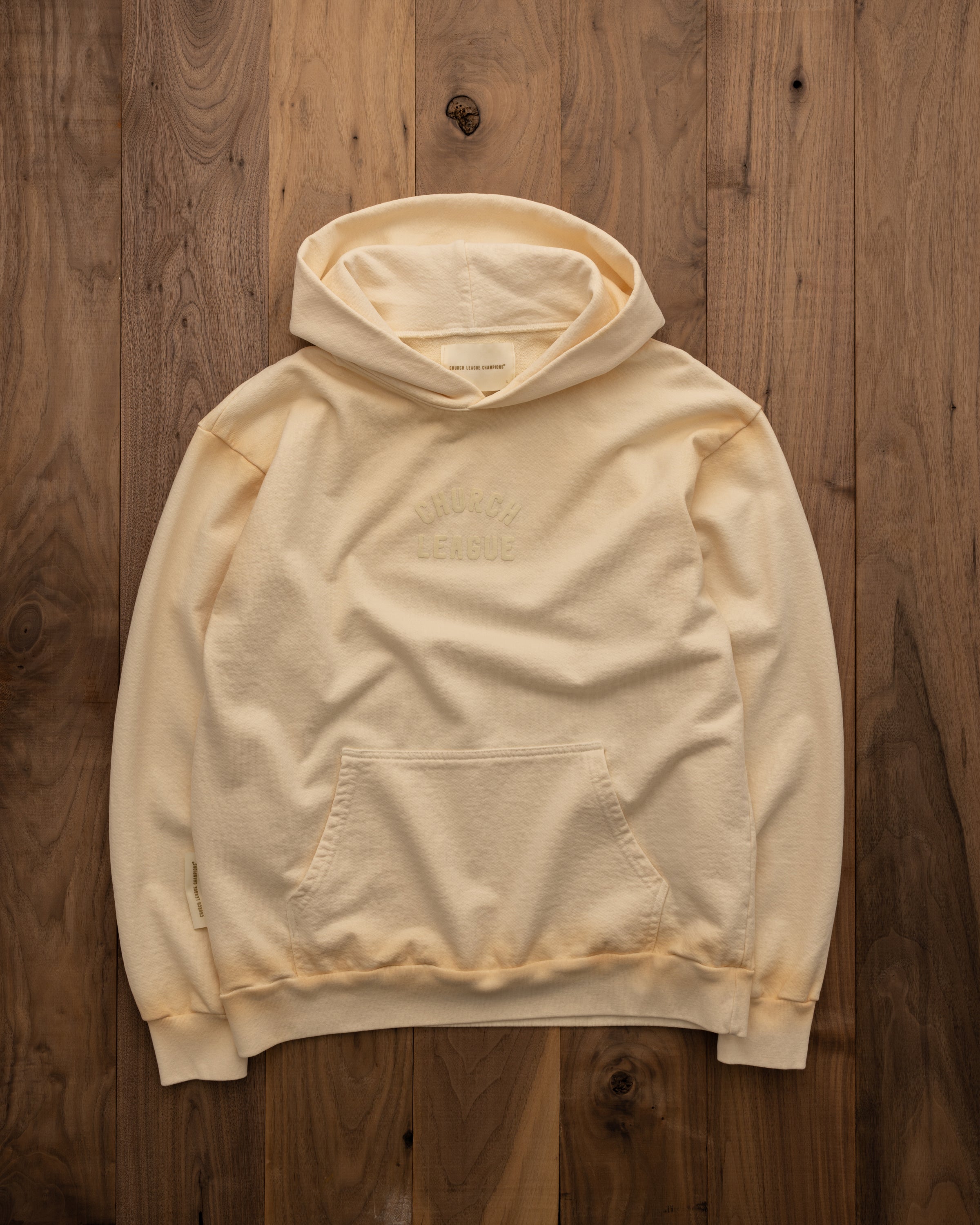 20 oz aged and enzyme wash french terry hoodie with subtle tonal branding at front with a heavenly motif across back