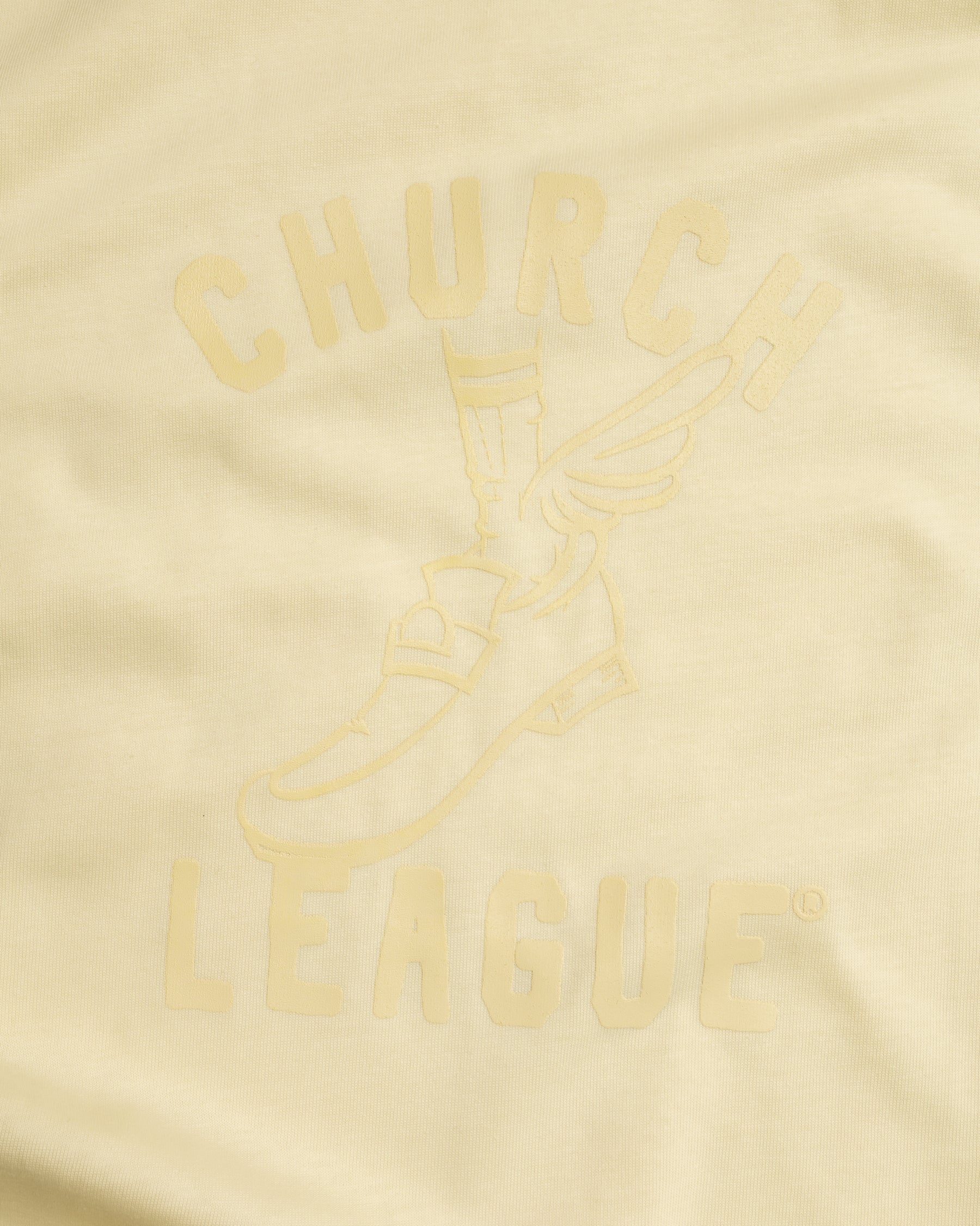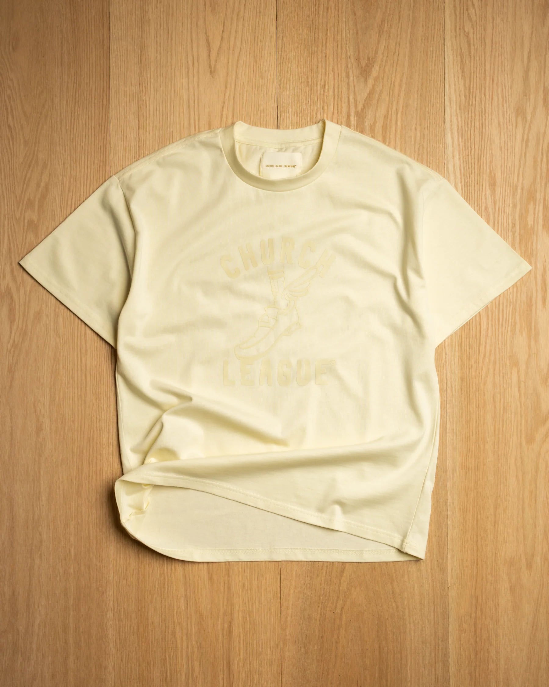Heavyweight oversize 8.2 oz construction t-shirt with high density screen print at front of a buttery soft cotton.